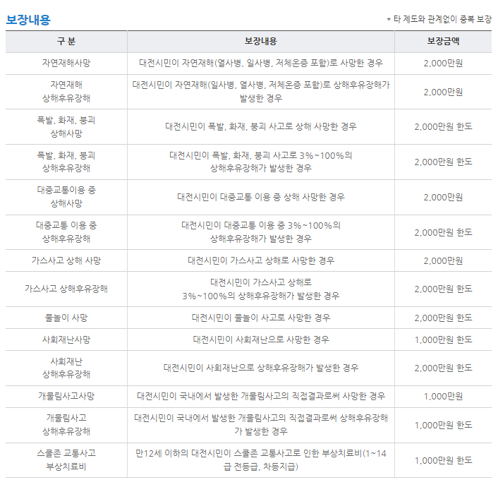대전광역시가 직접 보험사와 계약하고 비용을 부담하여 각종 재난 및 사고로 인한 사망, 후유장해 등에 대해서 시민들에게 보험급을 지급하는 제도입니다. 보험금 청구 사유 발생 시 잊지말고 얼른 청구하여 보상받으셔야 합니다.