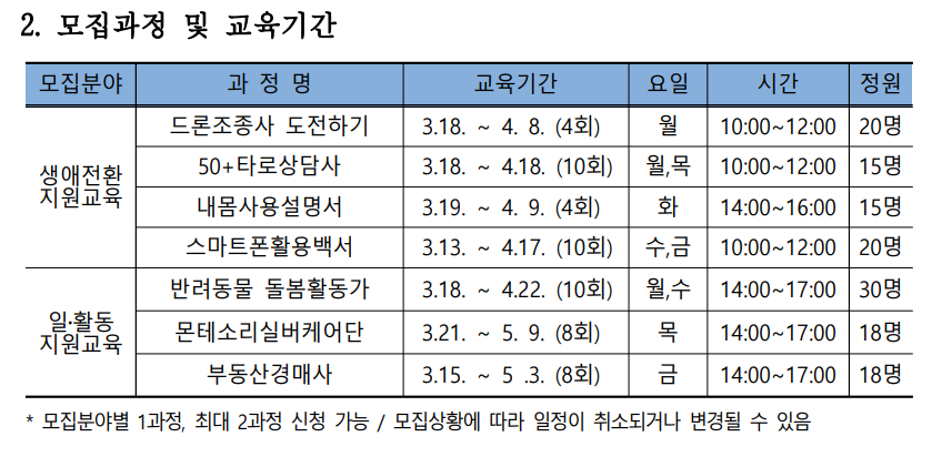 (4) 센터 사정에 따라 교육일정, 내용 및 강의 방식이 변경될 수 있습니다. 혹시나 다른 문의사항이 있따면 대전중장년지원센터(042-719-8351)로 연락을 하시길 바랍니다.