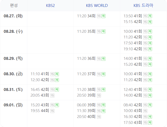 편성표를 보시고 다시보기(재방송) 및 회차정보도 아래에서 편하게 확인해보시기 바랍니다.