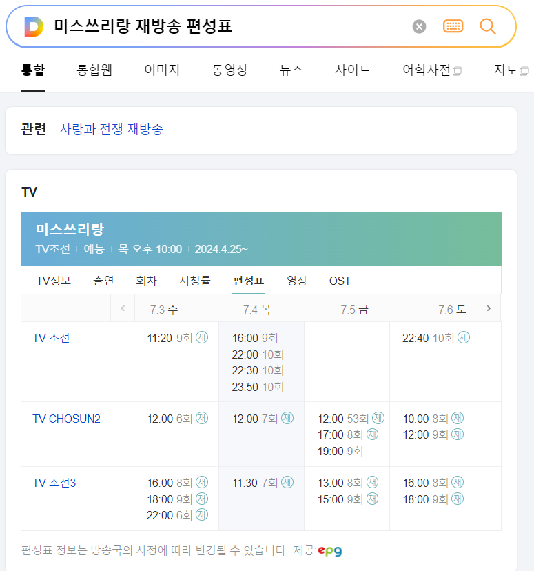 다음은 검색창에 "미스쓰리랑 재방송 편성표"로 입력을 하면 이렇게 어디서 어떻게 재방송을 할 계획이 있는지에 대해서 주르륵 나오고 있습니다. 편하게 본인 시간에 맞춰서 보시면 됩니다.