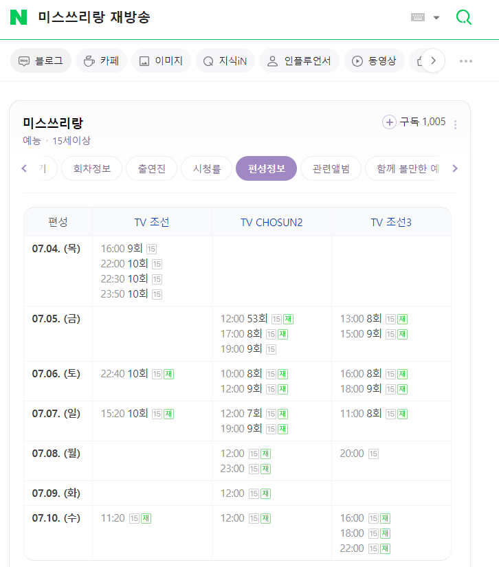 이렇게 네이버 검색창에 "미스쓰리랑 재방송"을 입력하시면 재방송 정보가 주르륵 나옵니다. 이 중에서 시간이 되는 때에 재방송을 보시면 됩니다.