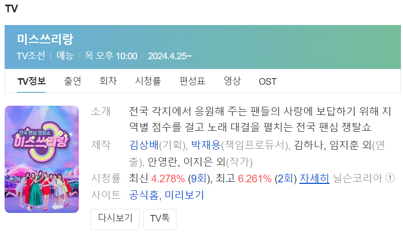 이상으로 미스쓰리랑 재방송 편성표에 대해서 알아보았습니다. 아울러 인기투표 및 각종 정보를 원하시는 분들은 아래 링크를 통해서 응원보내기 하자구요!