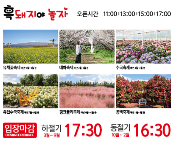 하절기(4월~10월)는 17시 30분까지 입장 마감이며, 동 절기(11월~3월)는 16시 30분까지 입장마감입니다. 제주도 꽃에 있어서는 수국축제가 무척이나 유명한 것은 다들 알고 계실 것입니다. 저 역시 제주도를 여러 번 다녀온 입장에서 제주도 체험 추천해달라는 지인들의 얘기를 들으면 제주 꽃 축제는 무조건 한 번 이상은 참석해보라고 권유합니다.