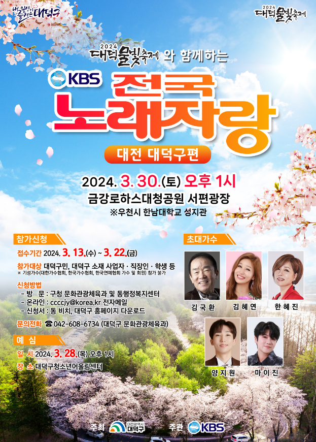 이번에 전국노래자랑도 대덕물빛축제 현장에서 진행된다고 합니다. 3월 28일 오후 1시에 진행될 예정이니 오랜만에 전국노래자랑이 궁금하신 분들은 찾아가보는 것도 좋을 것 같습니다!