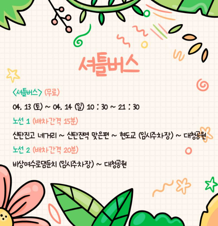 셔틀버스는 4월 13일(토) ~ 4월 14일(일) 10:30 ~ 21:30 이렇게 운행합니다.