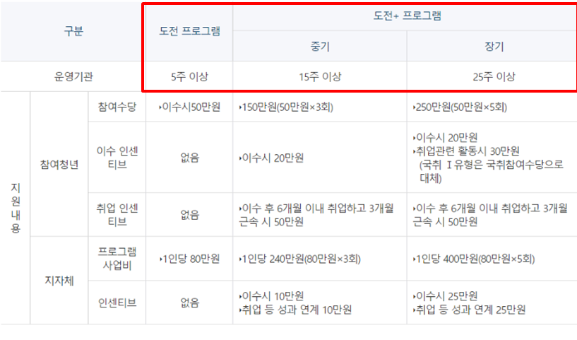 - 만약 25주 프로그램을 이수하고 취업관련 활동과 취업 성공 그리고 근속 기간을 모두 채울 경우 최대 300만원 지원