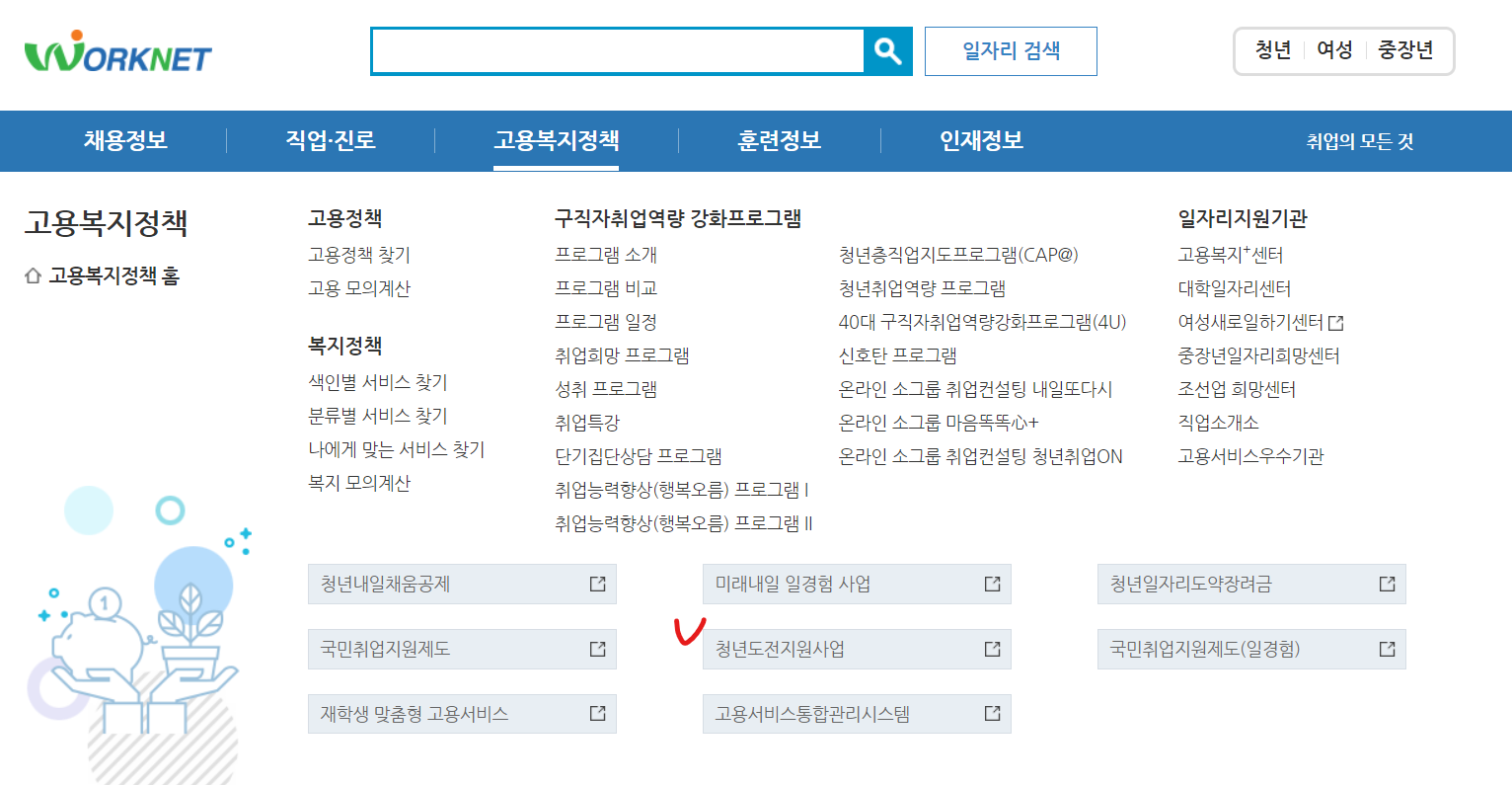 워크넷 홈페이지 접속 후에 고용복지정책에서 하단의 "청년도전지원사업"을 클릭합니다.