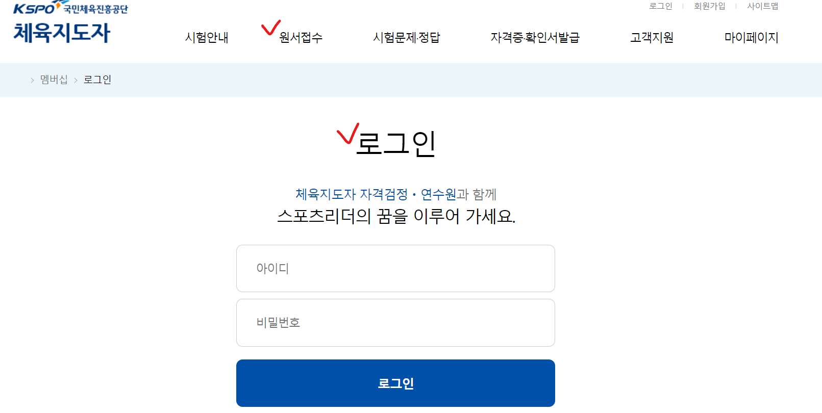 먼저 국민체육진흥공단 홈페이지를 접속하여 요강을 꼼꼼히 읽어본 이후에 접수를 하면 됩니다. 작년(2023)에는 한 시간만에 마감이 되었다는 얘기도 있으니 미리미리 회원가입을 해두고 필기시험 접수날이 되면 바로 접수를 하기를 권장합니다.