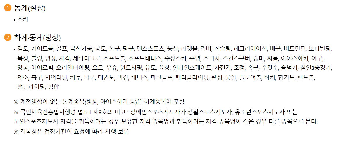 실기 및 구술시험은 하계와 동계로 나눕니다. 동계(설상)은 스키 종목이며 하계(빙상)은 대다수가 많이 하는 보디빌딩을 비롯해서 다양한 종목들을 취득할 수 있습니다. 각각 만점의 70%를 득점해야 합니다.